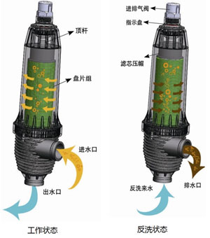 特点■ 盘式过滤芯是由一组两面带沟槽的盘片组成,沟槽棱边形成的交叉点可以把水中悬浮物及固体物截留,由于同时具有了表面拦截和深度凝聚的作用,大大提高了过滤效果。■ 盘式过滤器具有高效反洗、全自动连续运行、自耗水低、占地面积小、运行可靠的特点,过滤器系统的反洗过程轮流交替进行,工作、反洗状态之间自动切换,可确保连续出水,系统压损小,因此盘式过滤器的技术优势十分明显。 对传统盘式过滤器的提高与改进● 采用多项专利技术,安装使用时更加安全、高效,省水、省地、日常维护少;● 滤芯无弹簧设计,过滤时巧妙利用了来水压力压紧盘片组,这样使得反洗的压力要求大大降低;● 独特的内置鸭嘴阀,保证了滤芯在过滤时的最大出水量,同时反洗时起到很好的逆止功能;● 分体组装式的滤芯骨架,可以根据设计要求灵活调整滤芯高度,达到调整过滤面积的作用,满足不同的系统配套要求;● 抛弃了常用的金属卡箍设计,过滤单元采用自锁卡扣配合特殊设计的密封圈,过滤单元外壳的安装和拆卸变得非常简单容易,密封效果好;● 每个过滤单元均配有过滤和反洗状态指示装置以及自动进排气装置,在避免水锤破坏的同时还可以提高了滤芯反洗效果。过滤器工作原理工作状态● 来水从侧部的进水口沿切线进入过滤单元,腔内来水压力驱动外壳上部的隔膜装置,并带动顶杆下压盘片组,盘片组被压紧形成致密过滤芯,水中杂质被滤芯拦截后,出水经由滤芯中心部位的鸭嘴阀至下部的出水口;● 由于隔膜下压,透明上盖内的红色指示盘随着下压。反洗状态 ● 过滤单元反洗时,侧部进水口成为排水口,隔膜装置也就失去了先前的下压力,此时反洗来水从下部的出水口进入,由于鸭嘴阀的作用,反洗水只能经由四根带有喷嘴的导管向上顶开滤芯压帽和隔膜装置,松开盘片组,同时沿切线喷射出,使盘片旋转,盘上截留的固体物被冲洗除去;● 由于隔膜装置被顶起,透明上盖内的红色指示盘也抬起,在外部很容易看到并判断内部滤芯的状况;● 反洗时,上部的自动进排气阀会自动打开,空气可以进入腔体内,有助于提高喷射清洗效果。 盘式过滤器的应用:生活饮用水预处理各种生产工艺用水喷嘴保护循环水过滤给水处理预过滤中水处理废水处理 过滤器系统技术参数● 系统工作压力:0.2~0.8MPa; 反洗压力:0.15~0.8MPa● 工作温度:< 60℃● PH值:4-13● 过滤单元(A)数目:3-10个● 系统反洗方式:采用其他过滤单元的出水对每个单元逐个分别反洗,直到全部完成设计选型原水水质分类● 优良水质:城市自来水,从稳定的含水层抽取的井水;● 一般水质:循环冷却水,经沉淀处理过的地面水,经过有效沉积完全生物处理过的排水;● 较差水质:从水质很差的含水层抽取的地下水,经过有效沉淀,但未经或经很少的生物处理的排水,有微生物大量繁殖的地面水;● 很差水质:从很脏或富含铁锰的井中抽取的井水,受洪水影响且未经过沉淀的地面水,未经沉淀及生物处理的排水。过滤精度选择选择过滤器过滤精度即盘片,对保证盘式过滤器在整个水处理系统发挥应用的作用有着重要意义,只有选择合理正确才能满足后续的水质要求。下表为在常见的集中过滤用途时,推荐选择的过滤精度。 盘式过滤器选型表注:此表仅供参考